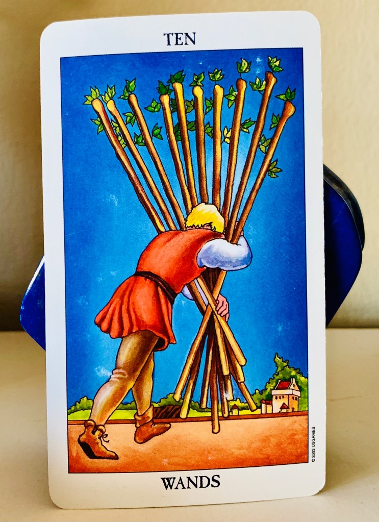A naked man and woman looking very much like Adam and Eve face each other separated by a phallic mountain behind them. They stand on a verdant bank. Behind the woman is the tree of knowledge with a snake circling around the trunk gazing curiously at the woman, perhaps waiting for the right moment to entice her to try one of the delicious apples. Behind the man is a tree with fiery leaves. Passion is his as knowledge is hers. These are the choices for each of them. The man looks at the woman, the woman looks up towards the heavens. What will bring these two together? How will the choose to cross the divide? Choice is the crux of the matter with the Lovers in Tarot. After all they are building a relationship. What kind of relationship will this be? A bright sun shines above. The Angel Gabriel appears out of the clouds in the blue sky with a blessing. He encourages the two to appeal to their higher nature and marry the divine spirit with earthly passion as they make their way on the earthly plane. In this time of crisis when we are faced with a mindset of lack and confusion, we are called to calm ourselves, look within, listen to the still voice of our soul. Be safe. Be healthy. Be strong. Believe. Namaste.