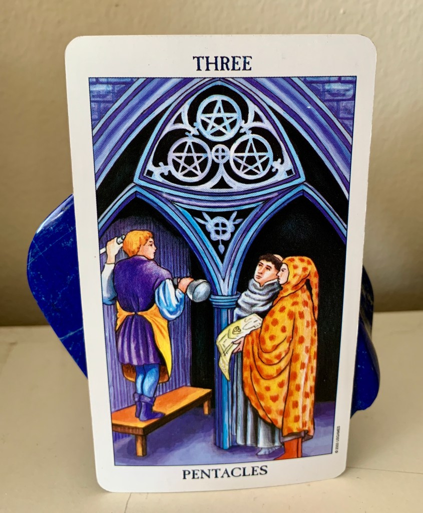 Pentacles are earth and business, three are trios and a balance of energy. Here we have a collegial scene. A wealthy business man, churchman and artisan confer on the building of a cathedral. What strikes me today is the respectful positioning of the artisan. He is standing on a workbench higher than the other two and in fact seems to be shining a light on the plans held by the wealthy patron. This is the new order where all work together in an attitude of mutual respect. Bring this attitude to work this week and see if things go along more smoothly. It is good to remember that each of us has unique gifts and talents that are necessary to make the thing work.